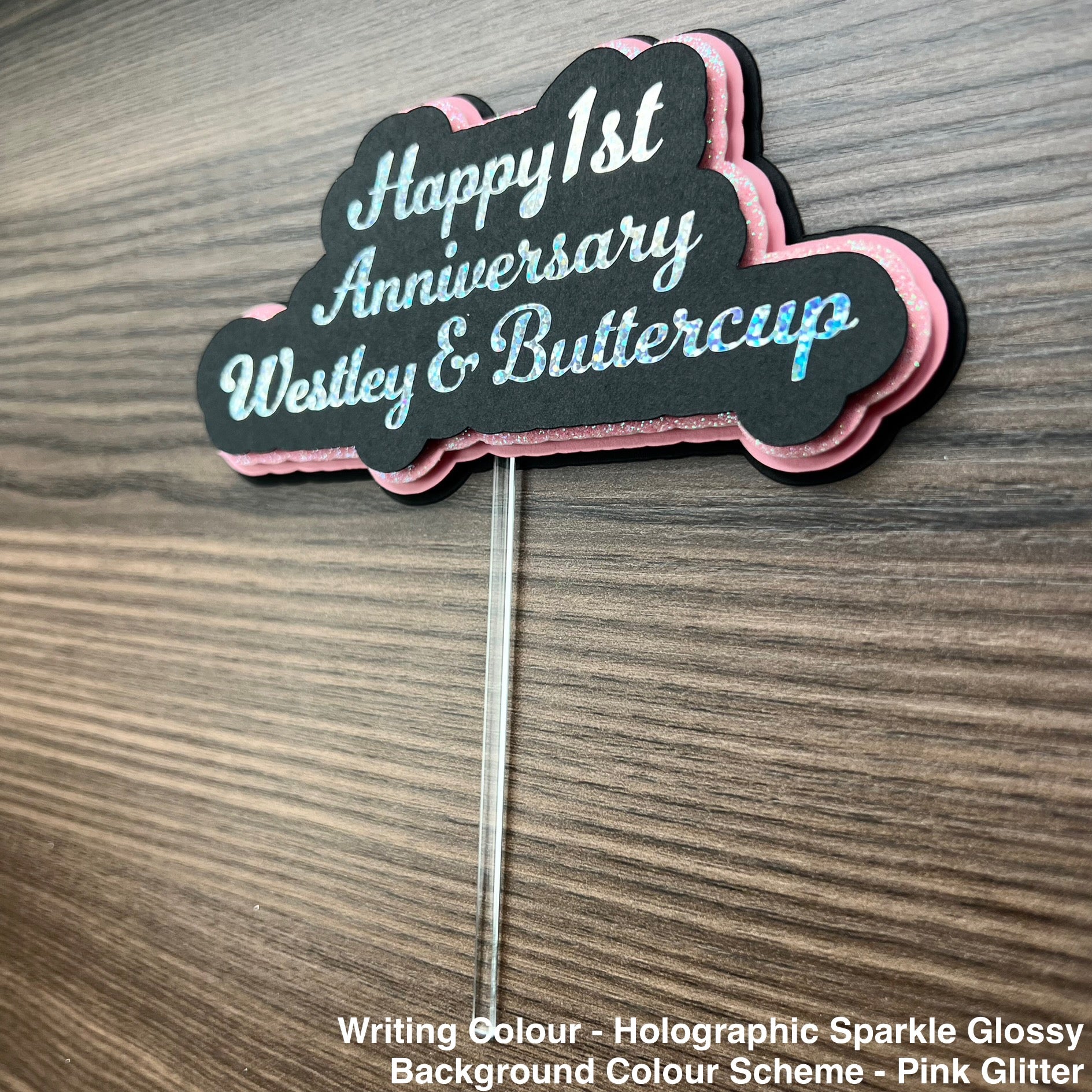 Elevate your anniversary celebration with this striking 3D cake topper, expertly crafted from premium glitter and matte cardstock. Personalize it with the celebrant's year and names to create a memorable centerpiece that captures the occasion. The dimensional design adds visual depth and sophistication to any cake, while the quality materials ensure durability throughout your event. A thoughtful finishing touch that transforms an ordinary dessert into a custom-designed statement piece.