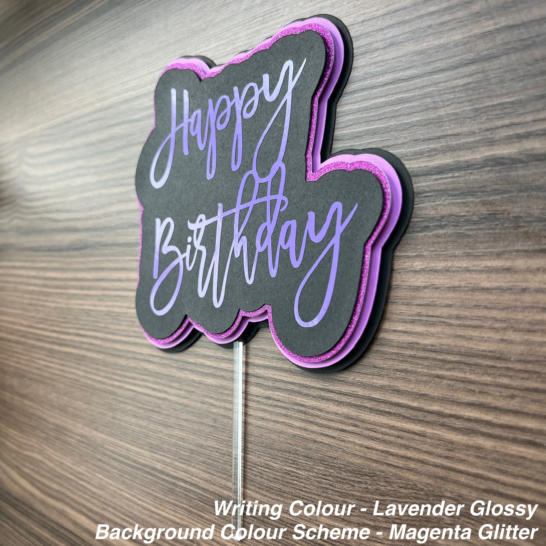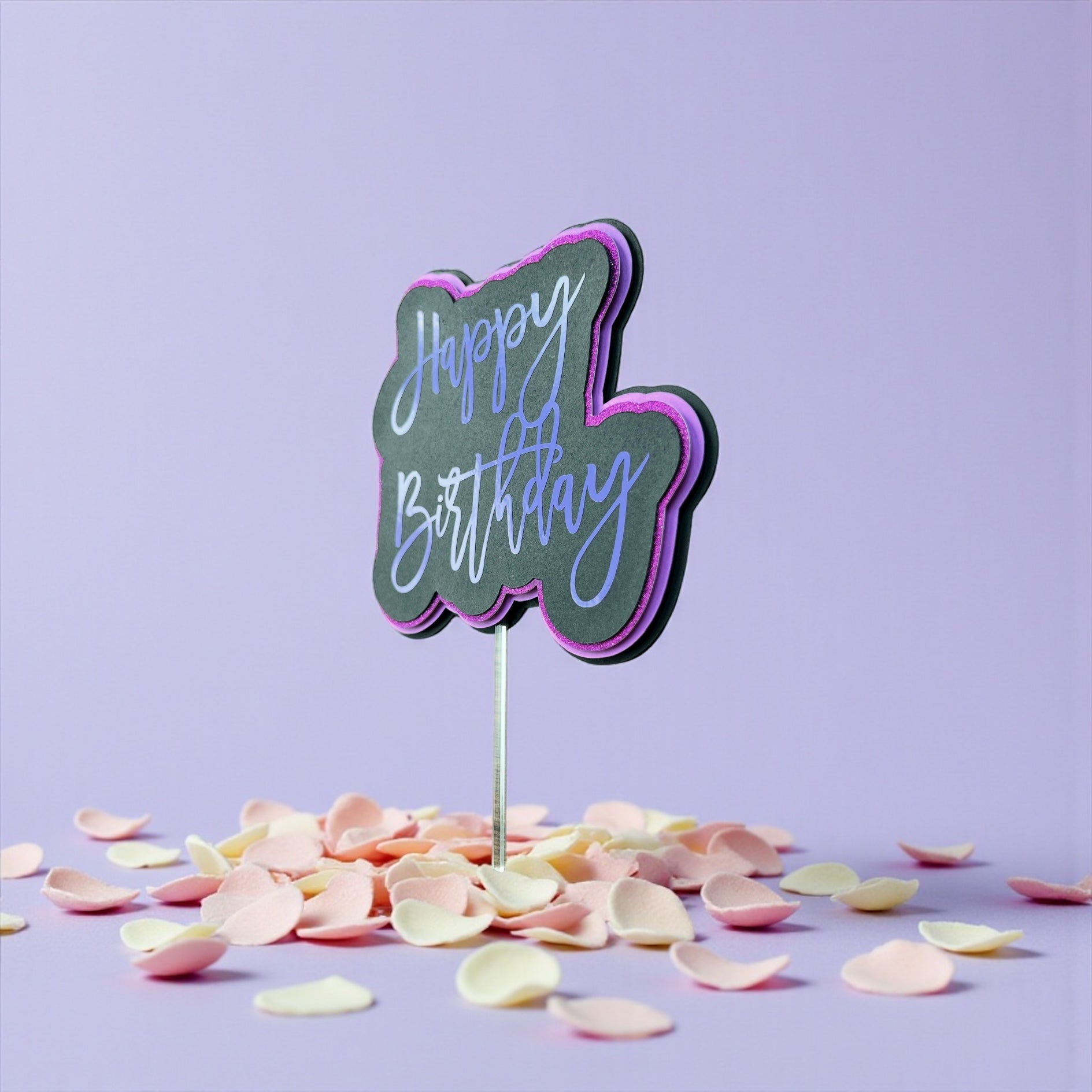 Elevate your birthday celebration with this striking 3D cake topper, expertly crafted from premium glitter and matte cardstock. Pick your own colour scheme for the writing and background to create a memorable centerpiece that captures the occasion. The dimensional design adds visual depth and sophistication to any cake, while the quality materials ensure durability throughout your event. A thoughtful finishing touch that transforms an ordinary dessert into a custom-designed statement piece.